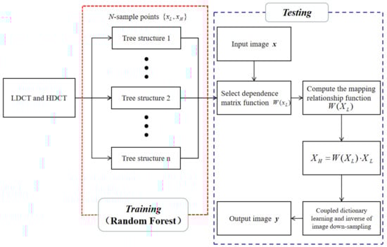 The first stage is the training stage (the red block). In this module, using the LDCT image and the corresponding HDCT image as a training set, according to the third section, a decision tree is generated by the training set and a random forest is trained to find the mapping relationship between the two images. The second stage is the test stage (the blue block). A non-training set LDCT image is used as the input image and using the developed mapping function and the LDCT image matrix , the new image matrix is reconstructed. Finally, the coupled dictionary learning of and is performed according to Equation (5), the inverse process of image down-sampling is performed according to Equation (4) to obtain the final reconstructed image.