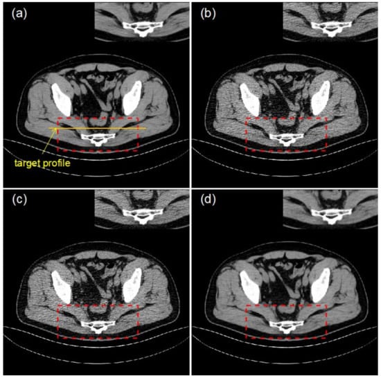 From left to right, top to bottom: (a) HDCT image; (b) LDCT image; (c) reconstructed image obtained using the bicubic interpolation method; (d) image reconstructed by the proposed method.
