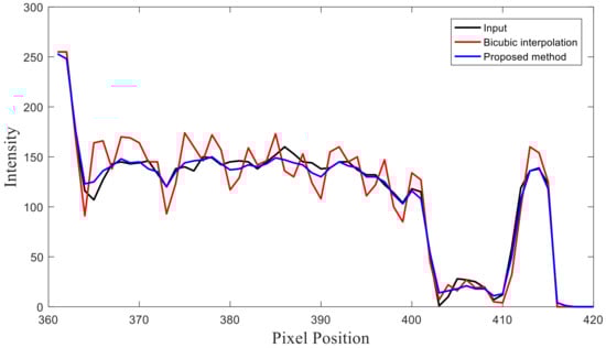 The profile and residual images are also compared in Figure 3 and Figure 4. It can be concluded that the effect and performance of the proposed method in image reconstruction is superior to those of the traditional bicubic interpolation method.