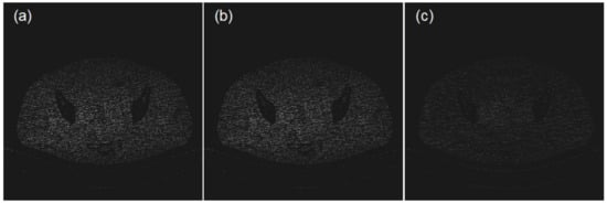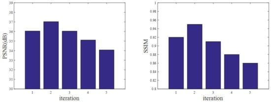 As shown in Figure 7a,b and Table 3, Table 4 and Table 5, the image quality clearly changes as the number of iterations changes. The correlation image quality parameters and are optimal when iterating twice, after which these parameters have a downward trend.