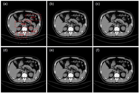 (a) HDCT image; (b) LDCT image; (c) Reconstructed image obtained using the bicubic interpolation method; (d) The image reconstructed by the method of this paper with 1 iteration; (e) The image reconstructed by the method of this paper with 2 iterations; (f) The image reconstructed by the method of this paper with 5 iterations.