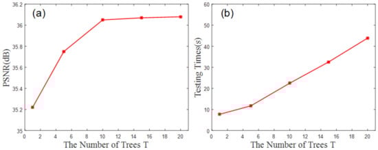 Figure 8a shows the effect of the parameter on the experiment. The PSNR value increases steadily and eventually becomes saturated as increases. As shown in Figure 8a, the PSNR is saturated when . Figure 8b shows the relationship between the number of trees and the total calculation time.