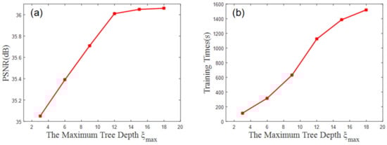 Figure 9a shows the relationship between the maximum tree depth and the experimental outcome. Tree depth has a strong influence on the training. Figure 9a shows that a steady state is reached when the depth , that is, the selected sample image is saturated. This relationship is reflected by Equation (15), which directly affects the training of LDCT and HDCT images. Figure 9b shows the relationship between the maximum depth of the tree and the training time. It is concluded that the maximum depth of the tree is .