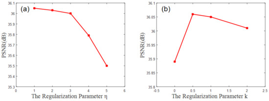 The regularization parameter of the linear regression in the leaf node mentioned in Section 2.2 and the regularization parameter of the splitting target mentioned in Equation (15) also have a certain influence on the final random forest result but their influences are not as obvious as those of the first two factors; consequently, comparisons are provided herein but detailed explanations are omitted. As shown in Figure 10a, when , the declining PSNR trend is obvious and in Figure 10b, a value between 0.5 and 1 is most appropriate; that is, the PSNR value remains the highest within this interval.