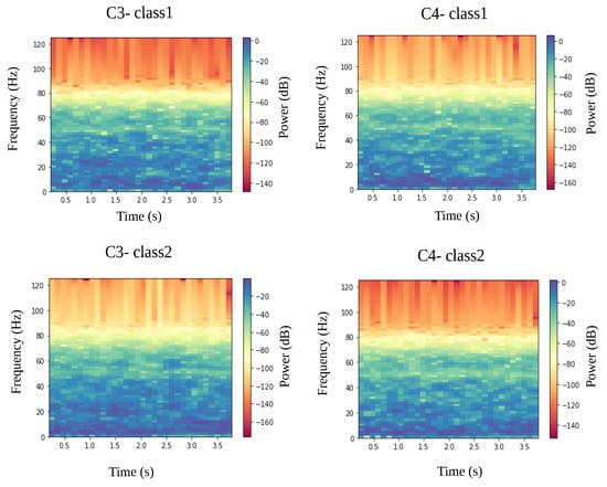 Example of the generated spectrograms from C3 and C4 electrode during left (class 1) and right (class 2) hand movements imagination.