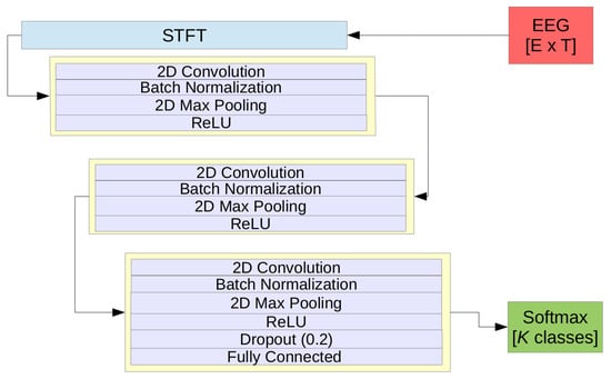 - Schirrmeister, R.T.; Springenberg, J.T.; Fiederer, L.D.J.; Glasstetter, M.; Eggensperger, K.; Tangermann, M.; Hutter, F.; Burgard, W.; Ball, T. Deep learning with convolutional neural networks for EEG decoding and visualization. Hum. Brain Mapp. 2017, 38, 5391–5420. [Google Scholar] [CrossRef] [PubMed]