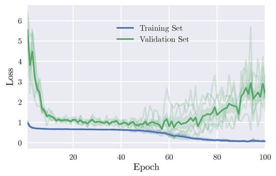 A mean accuracy of 77.72% () was obtained with the RCNN model as illustrated in Figure 5b. Overall, RCNN model seems to provide better accuracy than the LSTM and sCNN but worse accuracy than both the pCNN and dCNN. Furthermore, we wish to highlight that the RCNN model required more epochs of training to avoid overfitting.