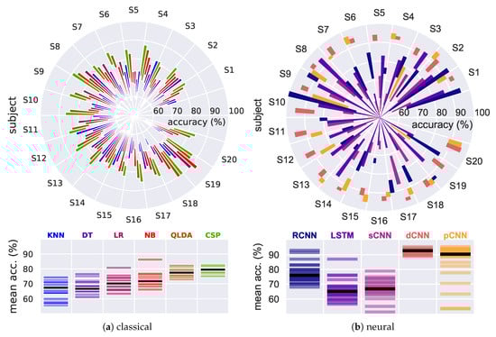 MI classification accuracies from 20 subjects using (a) traditional machine learning approaches and (b) different neural classifiers. The polar bar plot shows the accuracy range (mean ± standard deviation) achieved by the 5 models for each of the 20 subjects. The lower panel subsumes for each algorithm the 20 mean accuracies achieved, black bars indicate the median result.