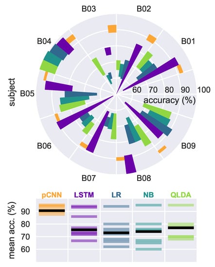 Furthermore, the achieved results with the sCNN model are also shown in Figure 5b The mean accuracy over all the participants is 66.97% (), which is barely lower than the presented results in [18] and close to the one obtained with the LSTM model. However, it should be noted that the sCNN shows less variance in the obtained accuracy across subjects and within different data splits compared to LSTM.
