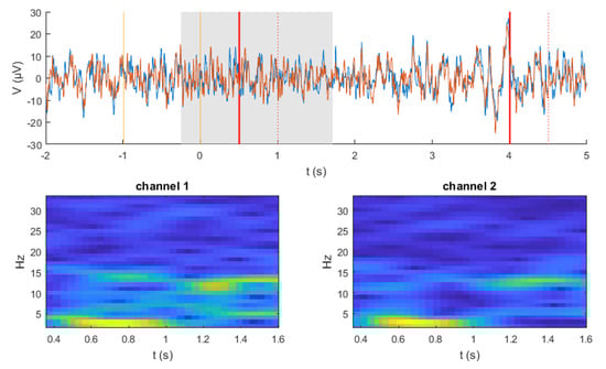 A frame of a live stream. Top: Filtered signal during a trial. Blue and red traces illustrate channel 1 and channel 2, respectively. Vertical lines indicate visual (orange) and acoustic cues (red). Bottom: Generated spectrograms from data within the grey rectangle shown above.
