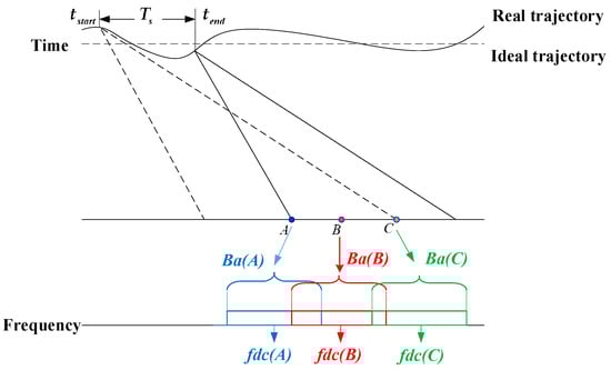 One of the main challenges of the airborne SAR imaging is the Doppler parameter estimation and compensation (DPEC) because the positioning, velocity, and angle information provided by the onboard inertial navigation system are generally not accurate enough for the high-squint high-resolution imaging []. Moreover, the real aircraft trajectories often deviate from the ideal trajectories due to unexpected disturbances [,,,] as shown in Figure 1, which leads to the Doppler parameter errors. If the spatially-variant Doppler parameter estimation (DPE) is not considered and left compensated, the SAR image quality will be seriously deteriorated. Thus, it is necessary to perform echo-based DPE to ensure good focusing performance [,,,,,]. For the VHS airborne SAR, the DPEC is more challenging because of its complex spatially-variant characteristics.