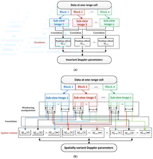 Traditionally, the DPE can be implemented by the multiple aperture mapdrift (MAM) via the azimuth multi-view processing. The basic MAM method (as shown in Figure 2a) [,] assumes that the Doppler parameters do not change with respect to target positions. In this case, the estimated Doppler parameters are the averaged results of the real ones. Although such approximation is valid for the broadside or small-squint SAR imaging, it is no longer valid for the high-squint cases because the spatially-dependent components of the DPE will seriously degrade the image quality if left uncompensated. Although there exist some methods for the spatially-variant DPE, such as the improved MAM (IMAM) method [,], their accuracy is limited as they only deal with the spatial variance of the second-order Doppler phase. In the VHS case, for instance, with a 70-degree squint angle [], the less accurate DPEC methods will lead to serious image quality degradation.