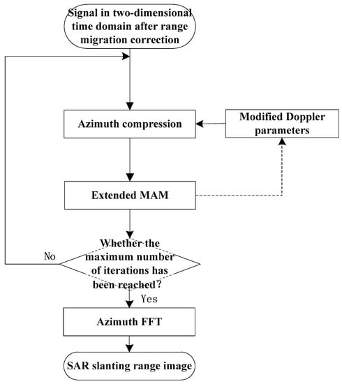 Use the fitting coefficients in (13) to correct the corresponding Doppler parameters in the high-squint airborne SAR imaging algorithm [] so as to achieve the focus improved image. In order to improve the accuracy of the Doppler parameter estimation, multiple iterations are performed. The flowchart of the azimuth compression combined with the EMAM method in the high-squint SAR imaging algorithm is shown in Figure 4.