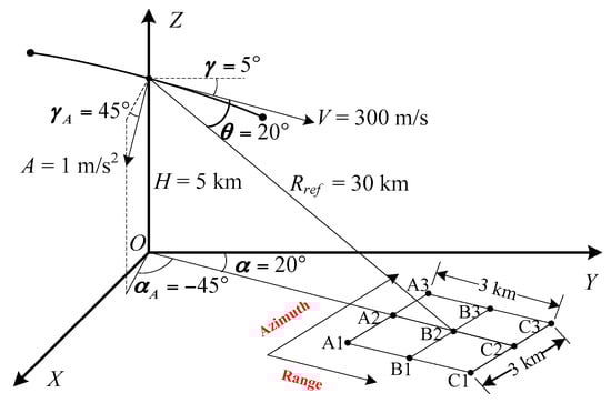 The spatial variance of the Doppler parameters is analyzed based on a typical VHS airborne SAR geometry, as shown in Figure 5. The plane is the ground plane. and are the velocity and acceleration of the aircraft. The velocity vector is in the plane. is the aircraft altitude. is the corresponding slanting distance. and are the velocity dive angle (between the velocity vector and the horizontal plane) and the acceleration dive angle (between the acceleration vector and the horizontal plane), respectively. and are the velocity azimuth angle (between the projections of the slanting distance vector and the velocity vector to the ground) and the acceleration azimuth angle (between the projections of the slanting distance vector and the acceleration vector to the ground), respectively. is the squint angle (between the velocity vector and the slanting distance vector). The aircraft motion time is 4 s.