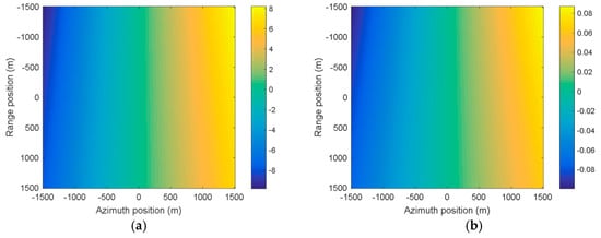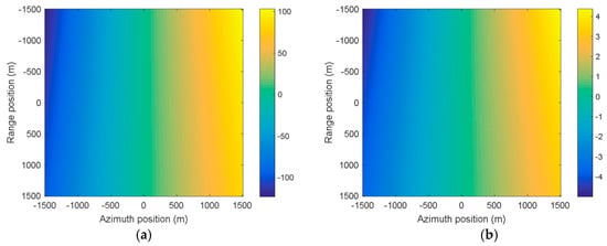 The spatially-variant phase errors caused by the spatially-variant Doppler parameters. (a) The phase error caused by the Doppler rate; (b) the phase error caused by the derivative of the Doppler rate.