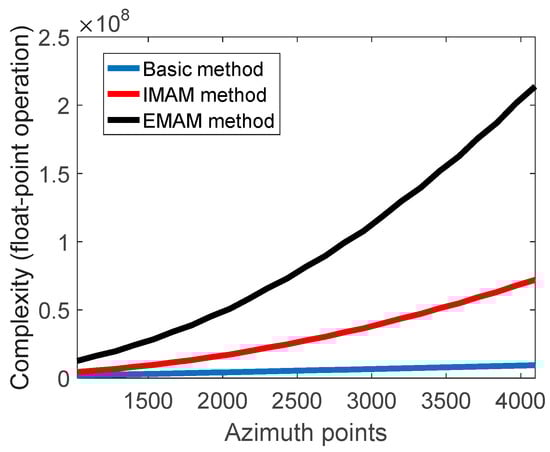 Assuming that the number of iterations is three, the window width in the IMAM method and the EMAM method is 100, and the number of sliding windowing manipulations is , then the complexity of the different methods can be compared as shown in Figure 8. It can be clearly seen that the complexity of the EMAM method is larger than the basic method and the IMAM method due to further estimating and compensating the first-order component of the spatially-dependent derivative of the Doppler rate, which increases the data processing time. When is 4096, the complexities of the basic method, the IMAM method, and the EMAM method are , , and , respectively. However, the computational complexity of the proposed method does not change qualitatively, and the real-time implementation of the EMAM onboard could be achieved after evaluating the existing hardware systems.