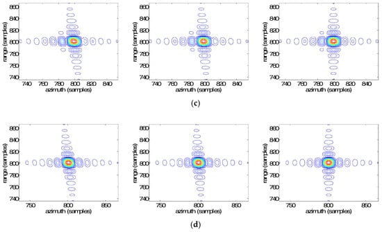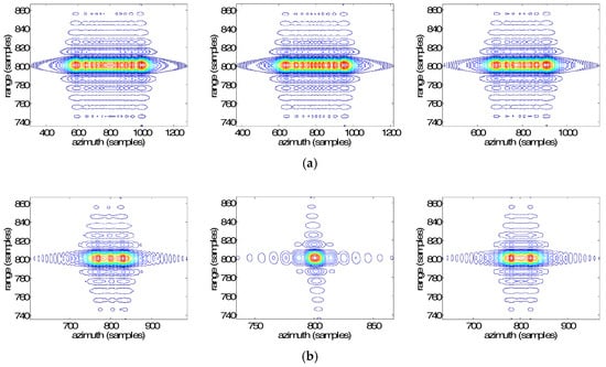 Figure 6a,b shows the spatial variance of the Doppler rate and the derivative of the Doppler rate, respectively. The center of the figure represents the beam irradiation position B2. It can be clearly seen that the spatial variations of the Doppler rate and the derivative of the Doppler rate are about and , respectively. Figure 7a,b shows the spatially-variant phase errors caused by the spatially-variant Doppler parameters, which are about 100 rad (larger than ) and 4 rad (larger than ), respectively. If the phase error caused by the Doppler rate is larger than , or the phase error caused by the derivative of the Doppler rate is larger than , it will seriously degrade the image quality. Thus, the spatial variance of the Doppler rate and the derivative of the Doppler rate should be estimated and compensated.