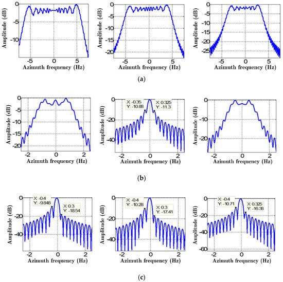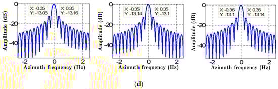 Figure 9 and Figure 10 show the two-dimensional imaging results and the azimuth impulse responses of targets by the different methods with the velocity and the acceleration errors, respectively. In Figure 9, the horizontal axis and the vertical axis represent the azimuth samples and range samples, respectively. In Figure 10, the horizontal axis represents the azimuth frequency and the vertical axis refers to the corresponding amplitude of the target (converted to dB). The sub-images from left to right represent C1, C2, and C3 in turn. Figure 9a and Figure 10a show the two-dimensional imaging results and the azimuth impulse responses based on the Doppler parameters with errors, respectively, and there is no Doppler parameter estimation. It can be clearly seen that the images are seriously defocused, and the Doppler bandwidths of the three points after the deramping are still about 10 Hz, indicating that there are still significant secondary phases, and the errors of the Doppler rates are very large. Figure 9b and Figure 10b show the two-dimensional imaging results and the azimuth impulse responses by the basic MAM method, respectively. It can be seen that the focus of point target C2 at the azimuth center is better, but point targets C1 and C3 at the azimuth edges are noticeably defocused. The main reason is that the estimated Doppler parameters by the basic MAM method are the averaged results of the real ones, and their spatial variance is not considered, resulting in the fact that the point targets at the azimuth edges still have significant secondary phase errors. Figure 9c and Figure 10c show the results of the IMAM method. It can be seen that the sidelobes of the three point targets are asymmetrical because the IMAM method only deals with the spatial variance of the Doppler rate. The peak sidelobe ratios are about −10 dB, as shown in Table 4. Figure 9d and Figure 10d show the results of the EMAM method. It can be seen that the targets both at the azimuth center and edges are well-focused, indicating that the EMAM method can estimate the spatial variance of the Doppler rate and the derivative of the Doppler rate well. The peak sidelobe ratios are about −13 dB, as shown in Table 4, indicating that the EMAM method has achieved higher estimation accuracy.