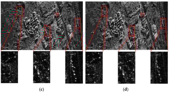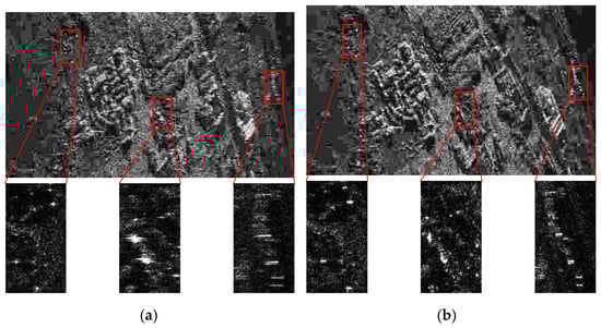 To validate the EMAM method in practical applications, this section gives the results of real airborne SAR data based on the different methods. The velocity of the aircraft is about , and the acceleration is about . The aircraft altitude is about . The squint angle is about 30°. The azimuth width of the image is about 1.2 km, and the range width is about 500 m. The data are processed based on the inertial navigation information (inaccurate), the basic MAM method, the IMAM method, and the EMAM method, respectively, and the results of the slanting distance image are shown in Figure 11. In the figures, the horizontal direction represents the azimuth frequency domain, and the vertical direction refers to the range time domain.
