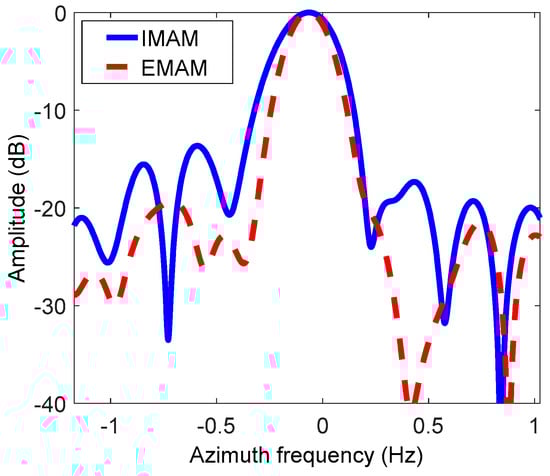 Figure 11a is the image based on the inertial navigation information. It can be seen that the defocus condition of the image is more and more serious from left to right, indicating that the spatial variance of the Doppler parameters is very obvious. The Doppler parameters calculated from the inertial information are closer to the real ones of the left scene. Figure 11b is the image based on the basic MAM method. The azimuth center of the scene is well-focused, but there is still obvious defocus at the azimuth edges, indicating that the estimation results of the Doppler parameters by the basic MAM method are the averages of the real Doppler parameters of the whole scene, which are close to the real ones of the central scene. Figure 11c,d shows the images based on the IMAM method and the EMAM method, respectively. It can be seen that the focus of the image has been significantly improved compared with the basic MAM method, but the comparison between these two methods is not obvious. Therefore, a strong scatterer in the small red square is chosen as shown in Figure 11c,d to further compare the two methods. Figure 12 is the azimuth impulse responses of the chosen strong scatterer based on the IMAM method and the EMAM method. It can be clearly seen that the azimuth sidelobe asymmetry exists in the IMAM result, while for the EMAM result, the main-lobe is narrower and the side-lobe is lower and basically symmetrical, which explains that the EMAM method is better than the IMAM method.