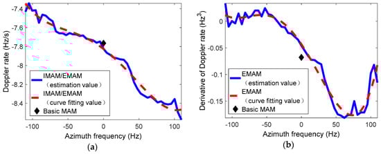 Figure 13 shows the estimation curves of the spatially-variant Doppler parameters based on the different methods. It can be seen from the figures that the Doppler parameters obviously change with the azimuth frequency. The estimation results of the Doppler rate and the derivative of the Doppler rate by the basic MAM method are basically the averages of the EMAM method. The blue solid lines represent the estimation results of the Doppler parameters by the IMAM method or the EMAM method, and the red dotted lines refer to the curve fitting values of the estimated Doppler parameters. As shown in Figure 13a, the IMAM method can estimate the spatially-variant Doppler rate, and the estimation result is basically consistent with the EMAM method; while the EMAM method can further estimate the spatially-variant derivative of the Doppler rate as shown in Figure 13b.