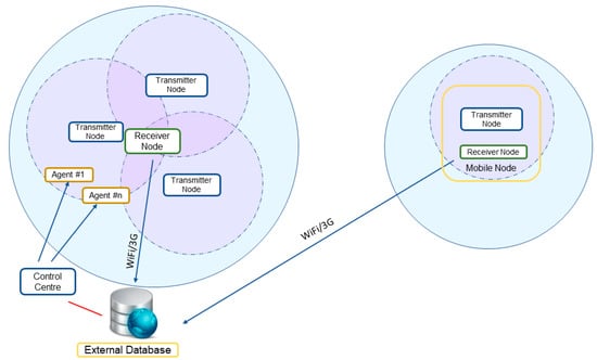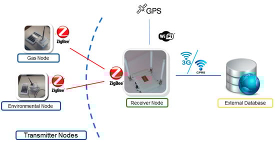 The proposed system has been developed on the basis of hardware components provided by Libelium (Zaragona, Spain) [59]. The transmitter nodes share a basic module, called Waspmote V. 1.2 (Libelium, Zaragoza, Spain) The addition of an XBee Pro S2 communications module (Digi, Minnetonka, MN, U.S.A.) provides the capability of using protocols like ZigBee or DigiMesh. The Receiver node is based on a multiprotocol router named Meshlium, also from Libelium, configured to work with ZigBee, WiFi, Bluetooth, and 3G/GPRS protocols, and including a GPS. The link between the Transmitter nodes and the Receiver node has been implemented using the ZigBee protocol (2.4 GHz). It can transmit small information packages with a range of over 700 meters (depending on visibility conditions). Network setup is fast and simple, and so is adding new nodes.