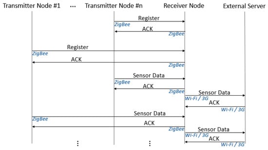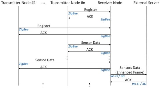 Once data from all the sensors have been received, the Receiver node builds an enhanced frame with data from all of them, includes location data and updates the internal database. Synchronization is then performed with the external database (via 3G or Wi-Fi, if available), where the information appears as data from a single node. A simplified protocol message flow diagram for this working mode is shown in Figure 5.