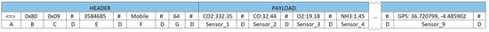 Figure 6 shows an example of part of an enhanced frame built integrating information from different Transmitter nodes. In this case, a Gas node including several gas sensors is installed. Location data are included by the Receiver node in an additional sensor field.