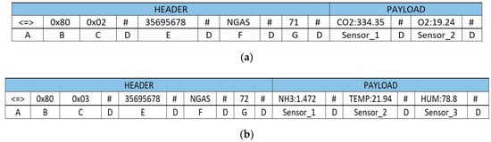Frame in networked mode with gas sensors data: (a) Frame with data from two sensors. (b) Frame with data from three sensors.