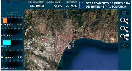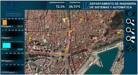 The external database is the input for an HMI developed for this application using LabVIEW (see Figure 10), making possible to present the information obtained by the different sensors, and related to their locations. The user can configure what sensors’ information is shown, according to the deployed nodes, including static nodes. For instance, Figure 10 shows how the user can see the available measurements for CO2, CO, O2, NH3, ozone (O3), atmospheric pressure, relative humidity and temperature, at the beginning of a route.