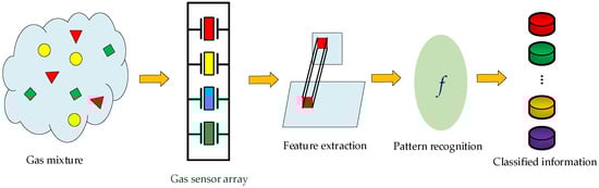 Generally, an EN is composed of a gas sensor array and a gas quantification/qualification unit. Figure 1 shows a typical frame diagram of an EN. The sensor array consists of a certain number of gas sensors, which plays the sensing role for gas mixtures. The sensor array responses are transferred and conditioned by the designed interface circuit and then acquired by a DAQ board [20]. The characteristics of the response signals are then extracted out as the useful features, and the extracted features are continuously put into a pattern recognition unit for classification and quantification. Finally, information of the type and concentration of the gas components in mixtures can be obtained.