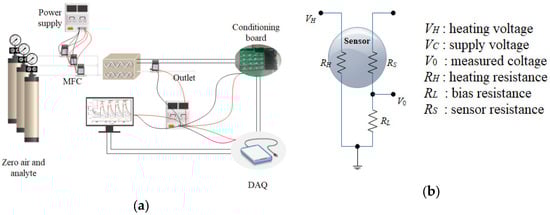 The sensors were operated at their recommended working temperatures, and are heated up by a RH with a fixed heating voltage of 5 V. The variance of sensor resistance is obtained through a voltage divider circuit with a bias resister RL, while V0 is the output of the sensor and acquired by a DAQ board. Figure 2a shows the diagram of the gas distribution and EN detection equipment, and Figure 2b shows the measurement circuit of gas sensors.