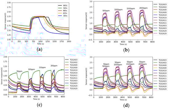 According to the test process, each concentration of each analyte was measured five times repeatedly. A total of 100 sets of raw data were obtained. The 12 sensor response signals were acquired by the DAQ at a sampling frequency of 1Hz. Some typical measured raw data are shown in Figure 3b–d.