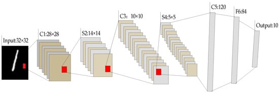 LeNet-5 is a gradient-based learning CNN structure and first successfully applied in hand-written digital character recognition [17]. The typical LeNet-5 structure diagram is shown in Figure 4. Its input layer is a hand-written digital picture of 0~9 with a size of 32 × 32, and its output layer has 10 nodes corresponding to numbers of 0~9. In addition to the input and output layers, generally LeNet-5 includes six layers, which are three convolutional layers, two pooling layers, and one fully connected layer. The size of convolutional core is set to 5 × 5 in the convolutional layer and the core in the pooling layer is set to 2 × 2. The full connection layer reduces the number of neurons from 120 to 84 to reduce parameter training.