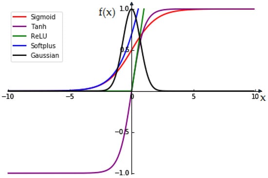 The five activation functions are shown in Figure 5. It can be seen that the output space of the Sigmoid and Gaussian function are at (0, 1), and the output space of the Tanh function is at (−1, 1). When the input is too large, the output of the Sigmoid function and the Tanh function tends to 1 and remains stable, but the Gaussian function tends to 0 as the input increases.