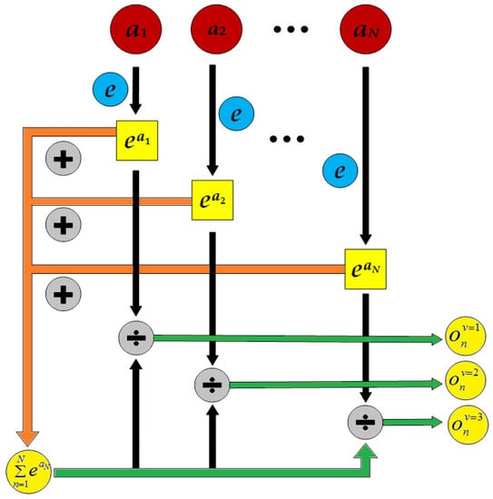Output layer is also called the softmax layer, which is represented by Equation (9). The softmax function is mainly used in the multiple classification process, which maps the output of the fully connected layer to (0, 1). Each output corresponds to the probability of classification, and their cumulative sum is 1. Finally, the classification of the maximum probability is selected as the output. The process of the softmax function is shown in Figure 6: