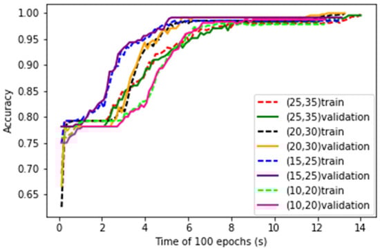 Each layer in the designed CNN structure has parameters that require training. In each layer of the network structure, the parameters are shown in Table 5. And the number of neurons is shown in Equation (14), where filterw and filterh represent the width and the height of the convolutional kernel, respectively. numberfilters represents the number of convolutional kernels.