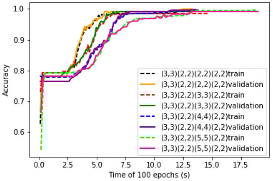 The sizes of convolutional kernels are also key parameters of the LeNet-5 structure. Four different sizes of convolutional kernels in C3 are studied in the structure of CNN. The convergence curves of the training process of four different sizes of convolutional kernels are shown in Figure 9. It can be seen that as the size of the convolutional kernel increases, the convergence rate of the learning curve decreases.