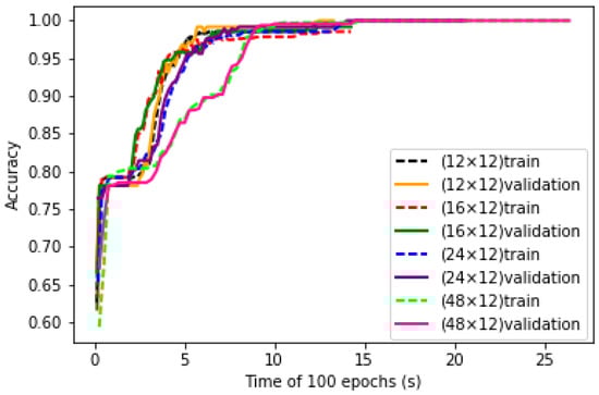 Four sizes of input matrix are studied. These data sets are used to train the LeNet-5 structure. The convergence curves of training process of LeNet-5 with four sizes of inputs are shown in Figure 10. It can be seen that with the increase of input matrix sizes, the convergence speed of LeNet-5 increases, which means that larger size of data input contains more information. However, with smaller size of input, after enough time of generalization of the structure, satisfied accuracy could also be reached.