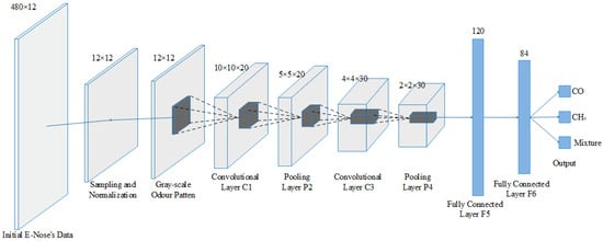 In order to adapt to the practical EN in our case, the improved structure and design of LeNet-5 are shown in Figure 11. The input layer is the gas sensor feature matrix with size of 12 × 12. C1 and C3 are the convolutional layers with kernel size of 3 × 3 and 2 × 2, respectively, and their numbers of convolutional kernels are 20 and 30, respectively. The outputs of C1 and C3 after convolution are 20 matrices with size of 10 × 10 and 30 matrices with size of 4 × 4, respectively. S2 and S4 are pooling layers with the same kernel size of 2 × 2. The dropout coefficient is 0.3, hence the number of neurons is 120 in the F5 layer and 84 in the F6 layer. The output layer contains three neurons based on the targets, corresponding to three target categories of CH4, CO and their mixtures, respectively.