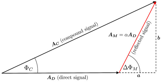 The superimposed multipath signal is composed by components of direct and reflected GNSS signals. This phenomena can be illustrated by means of a vector diagram, where the superimposed signal is the sum of two or more vectors representing the different signal components. Moreover, the length of the vectors denotes the amplitude of the respective signal components. In Figure 1, the respective vector diagrams for the superimposition of the direct signal and one reflected signal are shown.