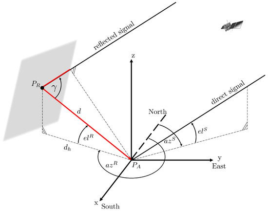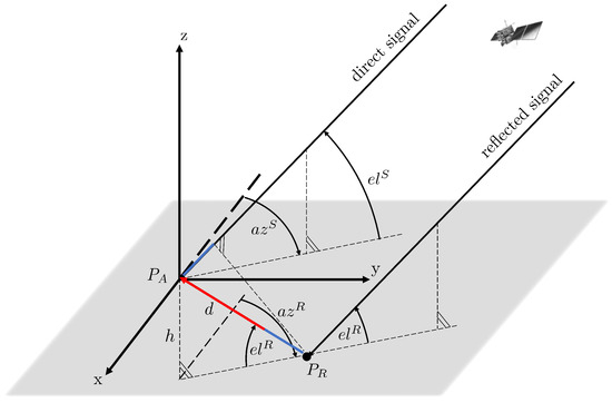 Here, and denote the azimuth and elevation angles of the reflection point, and and denote the azimuth and elevation angles of the satellite, respectively. The distance between the antenna along the signal path of the reflected signal is denoted by d, and denotes the respective horizontal component.