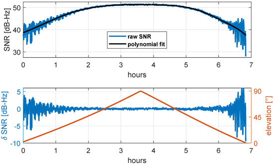 (Top) Raw signal-to-noise ratio (SNR) time series (blue) and polynomial fit (black) representing . (Bottom) SNR (blue) representing , after subtracting the polynomial fit from the raw SNR values, and related satellite elevation (red).