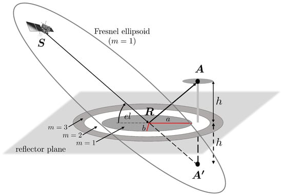 Between the satellite and the mirrored antenna point , a number (orders m) of ellipsoids of revolution can be formed, with and representing the respective focal points [37]. The Fresnel ellipsoid of first order defines the region where most of the energy is transmitted. The intersection of the Fresnel ellipsoids and the reflector surface is called a Fresnel zone. In the case of a horizontal reflector, the size and shape depends on the satellite elevation angle , the carrier wavelength and the vertical distance h between the antenna and the reflector. The semi-major and semi-minor axes of the first Fresnel zone are given by