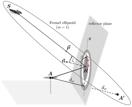The orientation of the major axis a of the Fresnel zones is given by the orientation of the line, resulting from the intersection of the reflector plane and a plane defined by , and . Using Equation (14), the Fresnel zones can be determined for every planar reflector, without any limitations regarding the satellite-reflector-antenna configuration.
