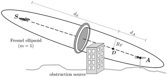In addition to determining Fresnel zones on the reflecting surface, the concept can also be considered for the line-of-sight (LOS) transmission in order to characterize the type of signal propagation [20]. In Figure 8, the Fresnel ellipsoid of the first order is shown for the LOS transmission between the satellite and the antenna .