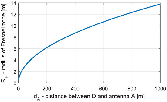 For a horizontal reflector, the size of the Fresnel zone increases as the elevation angle decreases, and it reaches its minimum at an elevation angle of . For an antenna height of m, this leads to m2 and for m, this leads to m2. Furthermore, the elevation angle determines the eccentricity of the ellipse (see Equation (11)). Thus, the Fresnel zone has a circular shape if the elevation angle is , and it is stretched for decreasing elevation angles.