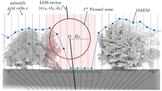 For the identification or exclusion of diffracted signals, in a first step, the grid cell that contains the satellite azimuth angle ( is identified, as shown in Figure 12). Afterwards, the radius of the first Fresnel zone is determined at position following Equation (15). After has been converted to the angular value , the azimuth angles of all points of the Fresnel zone are inside the interval . At the same time, all grid cells that intersect with the Fresnel zone are derived from (). In order to identify the obstructed areas of the Fresnel zone, it is sufficient to test if any part of the lower semicircle of the Fresnel zone boundary is lower than the elevation angles in the related grid cell. In Figure 13, an enlarged display of the relevant part of Figure 12 is shown.