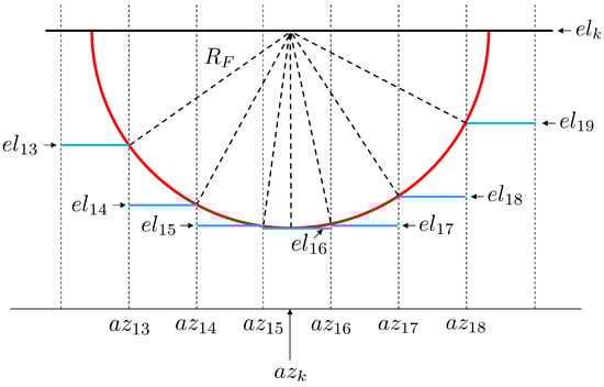 Enlarged display of the Fresnel zone and azimuth cell grid from Figure 12. The blue lines denote the elevation angles for the intersection points of the Fresnel zone boundary (red line) and cell borders (vertical dotted lines). The satellite azimuth angle is denoted by , and denotes the Fresnel zone radius.