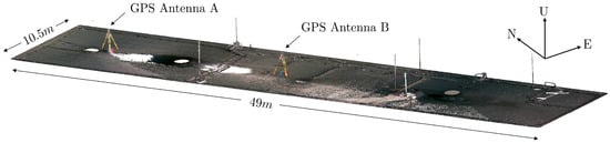 For about 24 h, two Leica AS10 GNSS antennas (A and B) in combination with Leica GS25 receivers were mounted on tripods with the same antenna height of 1.84 m and were placed at the positions shown in Figure 16. At both stations, dual frequency GPS observations were logged at a sampling rate of Hz. After the measurements, the raw observations were synchronized between the two antennas using the GPS time stamps in the respective RINEX files, and the azimuth and elevation angles for all observed satellites were determined from the broadcast ephemeris.